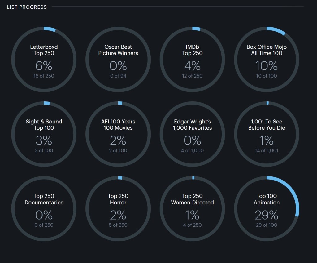 I am a Letterboxd pro user, which means that I have a stat page that shows me the progress that I have made on a variety of different lists that the website deems are important. Instead of picking a specific list and trying to watch from it, I’ve decided that I just want to generally make progress on the lists as a whole and see how it goes. At this moment, I still don’t feel like I know enough about what I do and don’t like in film to limit myself to one individual list and instead want to spend 2023 using all of these lists to explore my own interests, and perhaps narrow down to targeting individual lists in 2024. For my own records, here is a list of my stats thus far: